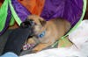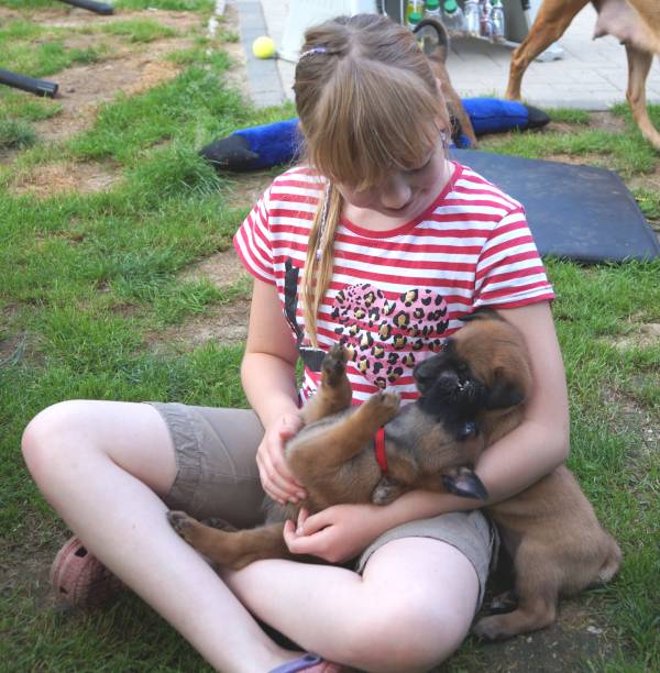 Die 5. Lebenswoche beginnen wir mit recht aktiven und unternehmungslustigen Welpen, die bei ihren Außeneinsätzen viel Spaß haben! Alle bewegen sich drinnen und draußen recht sicher und beknabbern und erkunden alles was nicht niet und nagelfest ist. Von den Steinen haben sich die ersten auch schon zur Wiese vorgearbeitet und haben sichtlich viel Freude an den verschiedenen Untergründen die sich ja alle anders anfühlen und so interessant sind. Fräulein Weiß und Fräulein Rot sind immer als erste unterwegs und auch Fräulein Rosa läuft recht sicher in neue Gefilde, genauso wie ihr Schwesterchen mit dem orangenen Halsband. Fräulein Lila ist grundsätzlich irgendwo verschwunden und frisst mir Möbel oder Türrahmen an. Alle sind sehr offen und frei. Die Herren sind zwar etwas gemütlicher, nehmen sich aber als erste Spielsachen wie Tunnel oder Flaschenvorhang vor. Ganz besonders freue ich mich über die Entwicklung von unserem Wurmling, der Frau Grün! Sie ist hat ja so einen Sprung gemacht und steht den anderen jetzt in nichts mehr nach, naja außer vielleicht an Körpergröße und Gewicht, das macht sie aber in Frechheit und Lebensfreude wett! Sie ist immer überall wo es etwas neues gibt und einen besseren Fresser habe ich noch nicht gesehen! Sie setzt sich vor den Napf und frisst bis sie bald platzt, wenn sie nicht mitten drin steht ;) und an der Milchbar hat ihre geringe Körpergröße auch den Vorteil, dass man sich leicht überall durchmogeln kann. Sie bekommt immer etwas ab und hat einen Zug wie ein Trinker! So eine tolle Maus! Hätte ich nicht gedacht, dass sie so viel Energie hat aber die macht sich echt toll! Die ersten Besucher waren auch schon hier und alle haben sich prima gezeigt. Wir sind sehr zufrieden und freuen uns auf eine tolle Zeit in Woche 5 ! |