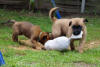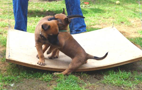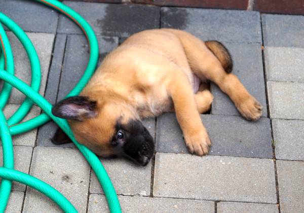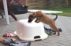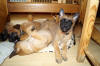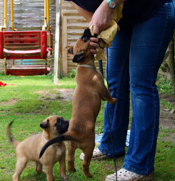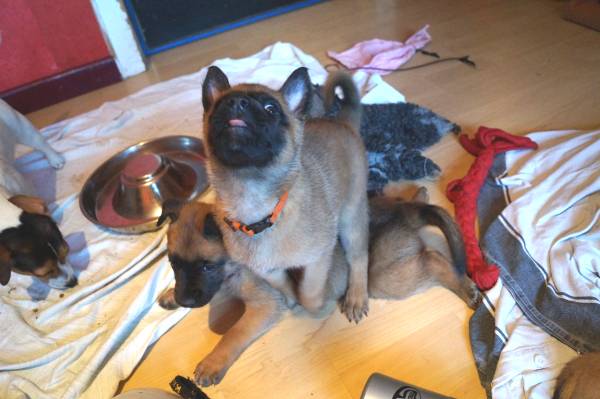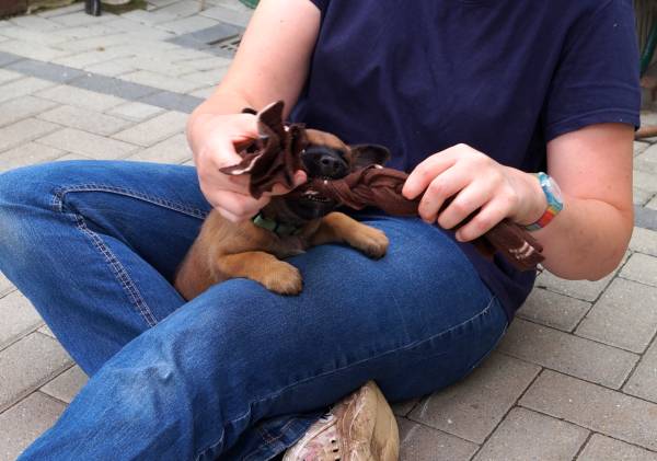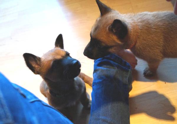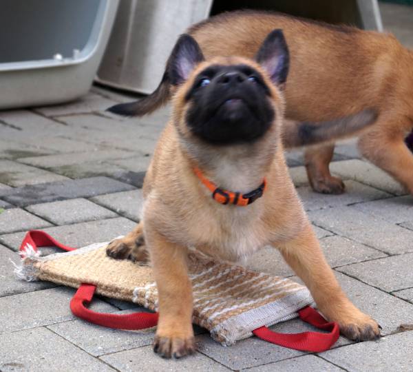 Frau Rosa und Mr. Black haben noch keine Lust die Ohren auf zu stellen. Der Rest hat zeitweise schon Stehohren. Bei Frau Orange stehen die Öhrchen schon richtig fest :) Ich bemühe mich neue Spielsachen zu basteln damit es den Maliattacks nie langweilig wird, denn dann kauen sie Sachen an oder fressen irgendwelchen Blödsinn. Wackelbrett und Plane sind schon eingenommen, Rappelkanister scheint langweilig. Bälle und Zerrspielzeug steht hoch im Kurs, obwohl schaukeln auch ok ist. Frau Orange wird mal Musiker, sie rennt immer mit einem Minitamburin durch die Gegend :) Eine Plastikrassel steht bei Frau Weiß und Frau rot ganz vorne. Frau Lila ist eine Meisterin des Tunnelbaus. Alle zeigen sich agil, fit und äußerst unternehmungslustig. Wir haben das Hauptfutter von Plantinum auf Wolfsblut umgestellt. Die Welpen haben auf den Plantinumstückchen gekaut wie auf Kaugummi. Sie lassen sich leider nicht einweichen und mörsern ist mir echt zu viel Arbeit. Außerdem wird der Output aufgrund der hohen Restfeuchtigkeit nicht so fest. Für eine Wohnungsaufzucht ist dies, so blöd das auch klingen mag, aber doch sehr erstrebenswert. WB kann man aufweichen, die Brocken sind kleiner und werden sehr gern gefressen. Wir mischen Frischfleisch und ab und zu auch mal Pansen und Fertigbarf mit drunter. Die Kleinen vertragen es prima, der Output wird fest und kann leicht aufgesammelt werden und der Züchter freut sich ;) Als Leckerchen geben wir aus der Hand Plantinum auch weiterhin und einmal am Tag dürfen sie es im Garten oder im Haus vom Boden aufsammeln. Suchspiele machen Spaß und beschäftigen die Bande bis ich mit dem Putzen fertig bin. Zum Trinken bekommen die kleinen Maliagatoren jetzt morgens eine Schüssel Welpenmilch und zwischendurch gibts Möhrensaft. Wasser steht natürlich auch immer zur Verfügung auch wenn das mehr zum Baden und Füße kühlen Verwendung findet.... Mama-Milchbar gibt es nur noch ein paar Minuten nach den Mahlzeiten, damit wir davon mal endlich weg kommen. Mama will immer noch zu den Welpen und lässt sich da kaum abhalten. Milch muss ja auch aus dem Gesäuge raus, aber wird jetzt immer weniger. Nächste Woche werden wir langsam anfangen mit Rückbildungstraining am Fahrrad. Cera ist noch sehr dünn, frisst jetzt aber auch wieder sehr gut und alles was man ihr gibt, so hoffe ich dass sie bald wieder ihre alte Konstitution erreichen wird. Sie wird nun Hochleistungsfutter bekommen um wieder Kräfte zu sammeln. Wir haben vor Ende der Woche mal zum Hundeplatz zu fahren und zwar mit der ganzen Familie. Mal schauen wie sich die kleinen Monster außerhalb der gewohnten Gefilde bewegen. Vielleicht auch eine Entscheidungshilfe für mich. Ist sehr schwer diesmal..... Puh..... sie halten mich echt auf Trab! Machen nur Blödsinn und probieren ständig neue Sachen aus. So Kabel beißen, Wäsche klauen, Terrier quälen, Körbchen rupfen, die obere Etage trotz Treppensicherung erklimmen..... und sie verschönern den Garten enorm ;) Werden alles kleine Innen und Außenarchitekten :) Woche 6 beginnt mit einem traurigen Verlust. Der kleine Rüde mit dem blauen Halsband, mein kleiner "Teddy", hat es leider nicht geschafft. Leider geht die Natur manchmal einen grausamen Weg, so junges Leben schon wieder zu nehmen, ich musste ihn über die Regenbogenbrücke ziehen lassen. Wir sind unendlich traurig. 7 kleine Maligatoren tun aber ihr bestes uns über diesen Verlust hinweg zu trösten. Diese Woche gehört vor allem wieder unserem "Wurmling" den wir nun liebevoll "Einzig" getauft haben. Sie darf natürlich noch einen anderen Namen bekommen, aber so lange sie hier ist, heißt sie so denn sie ist einzigartig! Einzigartig kämpferisch, einzigartig stark, einzigartig hinterlistig, einzigartig lustig, einzigartig schmusig und einzigartig verfressen! :) Sie ist echt der Hammer! So ein lustiger Vogel! Klar die anderen sind ihr in Körpergröße weit überlegen, aber das stört sie überhaupt nicht. Sie probiert alles was neu ist im Alleingang aus und wenn die anderen ihr blöd kommen wehrt sie sich mit allem was sie zur Verfügung hat. Oft gewinnt sie sogar und unterwirft den "Angreifer". Weil sie aber sonst nicht so viele Chancen hat ihr Ego auf zu polieren wie die dicken Brocken um sie herum, geht sie dann zu den anderen wenn diese kurz davor sind ein zu schlafen. Sie scheint ehrlich so lange zu warten bis Ruhe einkehrt um dann ihre Chance zu nutzen. Dann stellt sie sich über den ganzen Haufen schläfriger Chaoten, beisst den ein oder anderen in den Hals, schüttelt sie leicht durch und steht dann mit hocherhobener Rute über den anderen, als ob sie sagen wollte, seht her ICH habe alle unterworfen und bin hier der Boss! Wenn sie selber müde wird, sucht sie jemanden zum kuscheln und es dauert einige Minuten bis sie die richtige Position gefunden hat um endlich ein zu schlafen. Oder sie schläft auf meinem Schoß ein, auf dem sie sich ebenfalls minutenlang ein kuschliges Nest herrichtet um dann, wenn sie fertig ist einen Blick auf zu setzen der zum dahin schmelzen niedlich ist! Woche 6 ist aber auch die Zeit den Terrier auseinander zu nehmen und das Sofa, sowie alle Kabel die man so bekommen kann. Im Garten wird gebuddelt was das Zeug hält und in meiner Hose hängen regelmäßig mindestens 4 Welpen. Es kann mittlerweile echt weh tun, denn die Maliattacks können richtig feste zumachen! Auf jeden Fall halten sie uns alle auf Trab! |