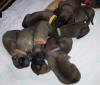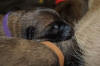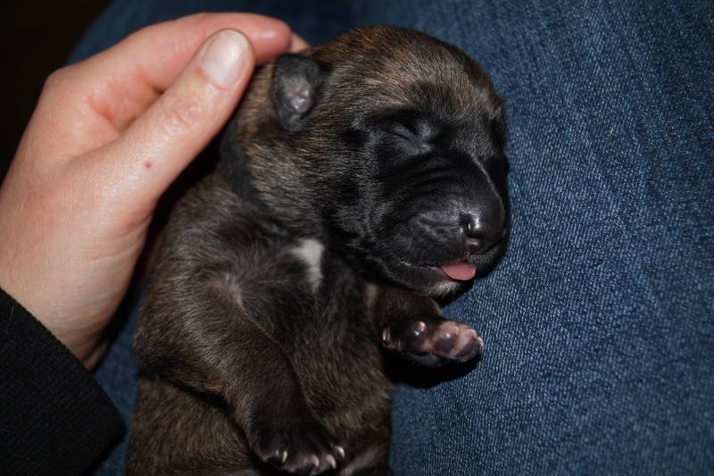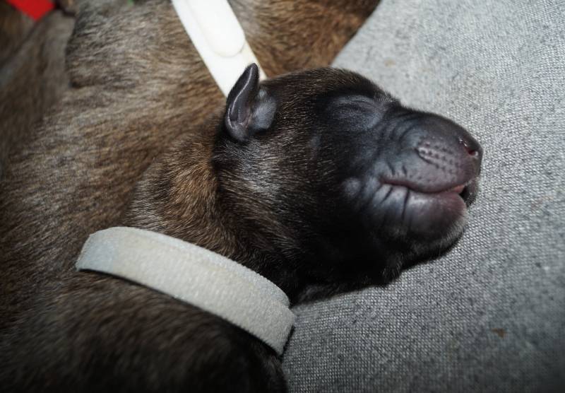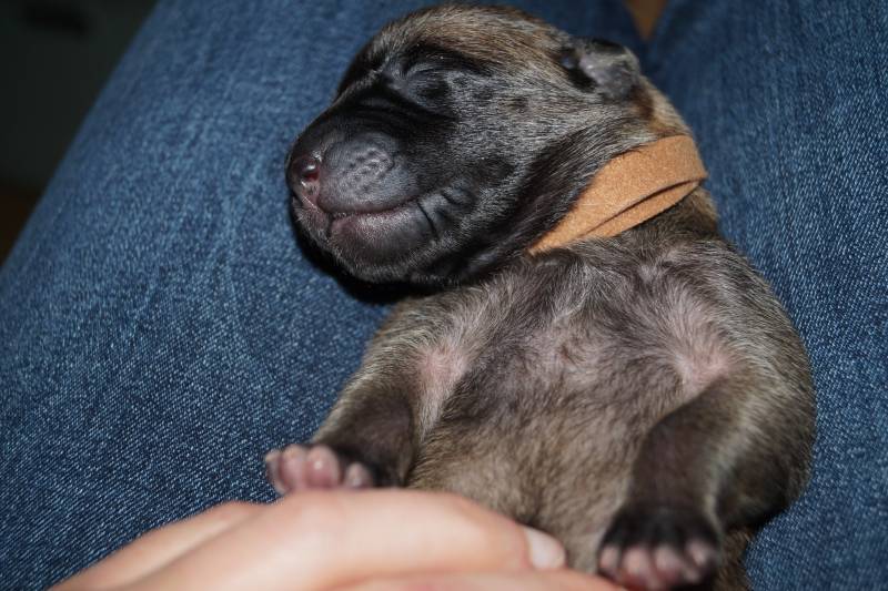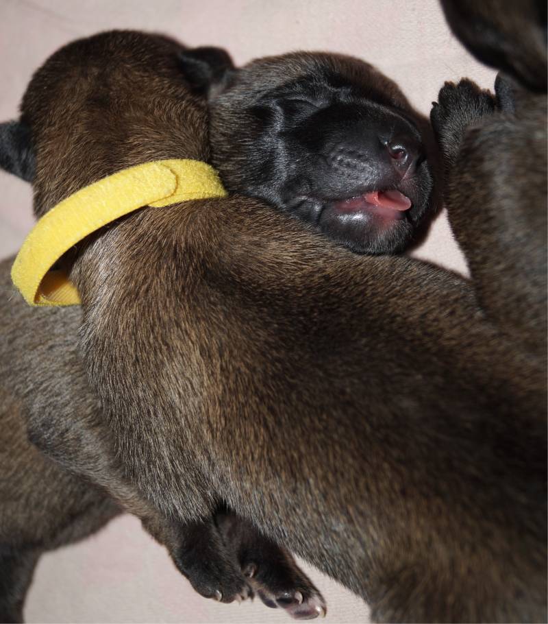 Am 3. Tag nach der Geburt stellt sich langsam etwas mehr Ruhe ein. Ceras Durchfall ist vorbei, sodass wir auch alle wieder ruhig schlafen können und die Welpen nehmen recht gut zu. Der kleinste im Bunde ist Herr Grün, aber er ist super agil und nuckelt sehr fleißig. Sorgen machen wir uns momentan um niemanden, alle erscheinen fit und gut entwickelt. Die schwerste ist Frau Rot, war ja auch die erste und hat schon einen kleinen Vorsprung. Cera scheint genug Milch für alle zu haben, denn wie man auf den Fotos sieht liegen alle Welpen nach dem Trinken satt und zufrieden mit vollgefressenen Bäuchlein, sogar von einander getrennt herum und schlafen friedlich. Weil Cera nachts nicht allein bleiben will und mir sonst die Welpen selber ins Schlafzimmer trägt , haben wir ihrem Wunsch entsprochen und oben wieder einen zweite Wurfkiste neben meinem Bett aufgebaut. Ja ich weis, bin bescheuert .... ;) bin ich aber gern.Gibt auch nichts schöneres als den Kleinen und ihrer Mama zu zu schaun und so hab ich viel mehr Zeit dazu. Cera ist ruhiger und ich kann sehen ob alles passt, gerade in den ersten Tagen für mich ein MUSS und ab jetzt einfach nur super schön. Die ersten 2 Nächte war es etwas unruhig, weil sich alles einspielen musste, jetzt wo jeder weis wie es funktioniert und so auch alle satt werden, schlafen die Kleinen ruhig von ersten Bell- und Knurrversuchen mal abgesehen, die ich aber super niedlich finde :D Überhaupt sind die Geräusche in der Wurfkiste immer das absolut Beste um diese Zeit :) Noch sind sie pflegeleicht und Mama kümmert sich prima. Wir genießen die Zeit!