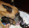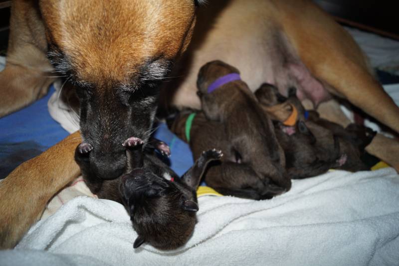 Geburtsverlauf : 4.45 Uhr Hündin wird unruhig Scharrzwang, Hecheln, Zittern, Entleeren, Erbrechen, Fruchtwasserabgang 5.30 Uhr Erste Presswehen 6.00 Uhr Erste Austreibung; Welpe agil und gesund, Hündin pflegt instinktsicher und fürsorglich. Nächste Austreibungen bis Welpe 6 etwa alle 15 Minuten. Nach einer Stunde Pause und kleinen Spaziergängen in den Garten leben die Wehen wieder auf. Ab 8.50 Uhr folgt dann wieder alle 15 Minuten ein Welpe. 10.45 Uhr letzte Austreibung. Geburt verlief komplikationsfrei und ohne Anwendung von Wehen fördernden Mitteln. Alle Nachgeburten wurden ausgetrieben. Der gesamte Wurf und die Mutter erscheinen gesund und agil. |