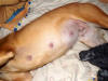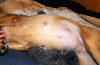 Gestern war Tag 49; Woche 7 (Bauchumfang ca 76 cm) Der Tierarzt war da, Cera hat ihre zweite Herpesimpfung bekommen. Um jeglichen Stress zu vermeiden, haben wir das zu Hause machen lassen. Das war zwar überraschend für Cera, dennoch wusste sie genau, dass die nette Frau mit den weißen Klamotten garantiert kein normaler Besucher war! Begeistert war sie also nicht, aber was sein muss, muss sein! Eine Untersuchung funktionierte leider aufgrund aufgespannter Bauchmuskeln mal so überhaupt nicht. Cera beschützt ihren Bauch vor jeglicher Berührung, nur ganz selten darf ich selbst mal in ruhe nach den Welpen fühlen, auch leichtes Handauflegen duldet sie einfach nicht. Naja ist auch noch was früh, vielleicht klappts nächste Woche ;) Davon mal abgesehen, dass sie Spritzen und Tierärzte nicht mag, geht es Cera aber ausgesprochen gut. Sie frisst gern und ruht viel, springt aber die restliche Zeit auch gern herum wie ein Flummi. Spazieren gehen wir mit dem ganzen Rudel normal und sie läuft auch gerne vorweg wie immer. Nur mit anderen Hunden muss ich sehr aufpassen, das Feld gehört nämlich ausschließlich Cera! Mal schaun ob sie denn tatsächlich irgendwann mal deutlich ruhiger wird.... Der dicke Bauch scheint wenig bis gar nicht zu stören. Jeden Abend, wenn sie müde ist, versuche ich jetzt vorsichtig Welpenbewegungen zu ertasten. Bijou hat diese Schmusestündchen immer sehr genossen und ich auch, aber Cera scheine ich damit mächtig auf den Keks zu gehen ;) Die Haare um die Zitzen fallen aus und das Gesäuge wird nun deutlich dicker. Noch 14 Tage dann ist es schon so weit! Tag 46 (Bauchumfang ca 76 cm)