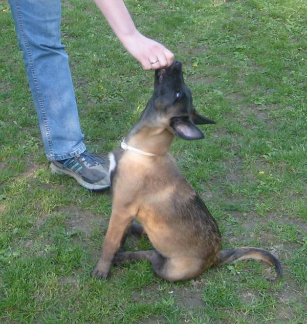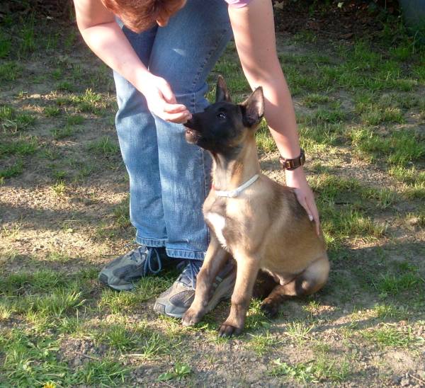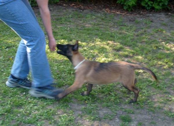 Im Moment können wir mit Cat wegen der beginnenden Zahnung nicht in der Abteilung C trainieren. Auch beim gemeinsamen Spiel sind wir jetzt sehr vorsichtig und vermeiden großes Ziehen und Zerren. Meist wird die Beute nun zum Anbiss angeboten und sofort dem Hund überlassen oder Cat darf einer Rolle oder einem Ball nachjagen, wenn dieser geworfen wird. Die Hündin bringt Beute bereitwillig zum Hundeführer zurück um ein Zerrspiel an zu bieten , dabei sind wir dann eben etwas vorsichtiger. Zur Zeit trainieren wir spielerisch das ruhige Halten der Beute, damit wir später in der Abteilung C eine bessere Kontrolle über den Hund bekommen. Ich finde es sehr wichtig das der Hund nicht ständig mit dem Ärmel schlägt, wenn er ihn tragen darf. Vielmehr möchte ich einen Hund der sich ruhig halten lässt, wenn er die Beute geschenkt bekommt. Hektik, Beuteschütteln und Knabbern möchte ich somit vermeiden und nach Möglichkeit ein gutes Griffverhalten fördern. Auf jeden Fall soll der Hund auch wenn er im Trieb steht leicht kontrollierbar bleiben. Hierzu darf Cat die Beute tragen, dann greife ich mit einer Hand unter den Fang und mit der anderen ins Becken des Hundes und gebe das Kommando RUHIG. So halte ich den Welpen einige Sekunden, wenn er ruhig stehen bleibt gebe ich ihn mit einem JA wieder frei. Für Cat gehört diese Handlung von Zeit zu Zeit einfach mit ins Spiel hinein. Sie bleibt dann stolz mit ihrer Beute im Fang stehen und lässt sich gern von mir streicheln und loben. Danach gibts dann wieder Action und das Spiel geht weiter. In der Abteilung C wird uns das Kommando RUHIG sicher noch nützlich sein.