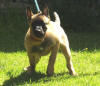 Dizzy mit 3 Monaten bei der Arbeit in der Abt. C Die kleine Maus ist jetzt 14 Wochen alt und hat schon mächtig Spaß am Beutemachen! Wir treiben zu Anfang den Helfer mit der Beute auf den Platz, da wird er dann gestellt und des Lederläppchens enthoben :) Wir lassen Dizzy nach der "Treibjagd" nach hinten anbeißen, damit sie sich eine schöne Anbisstechnik angewöhnt und ihren Sprungpunkt selber findet. Heißt der Helfer bietet die Beute an und der HF lässt den Hund an lockerer Leine kommen um dann nach dem Anbiss die Leine wieder stramm zu ziehen. Dizzy beißt genau wie ihre Mama selbstständig hoch an und springt schön in die Beute, sie macht volle, feste und ruhige Griffe ohne Knurren oder Fiepen. Sie trägt die Beute stolz und absolut trocken. Bei der anschließenden Kontrolle durch den HF bleibt sie ruhig stehen und hält auch hier ganz ruhig fest. Kontrolle finde ich jetzt schon sehr wichtig, weil man da später einfach nicht mehr so leicht heran kommt. Ich halte Dizzy mit einer Hand unter dem Fang und mit der anderen im Becken, damit sie ruhig steht. Das kennt sie aber auch aus dem gemeinsamen Spiel Zuhause. Ich möchte dass der Hund lernt Vertrauen zu mir zu haben. Ich nehme ihm die Beute nicht weg sondern wir beide machen Beute zusammen! Letztendlich bestimme ich wie das Spiel gespielt wird und zwar von Anfang an. Das heißt aber nicht, dass es keinen Spaß macht! Irgendwann nehme ich sie dann am Halsband und gebe Kommando AUS. Momentan muss ich beim Trennen noch ein wenig nachhelfen aber sie lernt schnell, dass das Spiel ganz schnell weitergeht wenn der Lappen gefallen ist, denn gleich nach dem Lösen macht der Helfer wieder Trieb und es gibt einen erneuten Anbiss. Wir achten darauf, die Beute nur zu schenken, wenn der Griff voll ist, aber da Dizzy selber bestrebt ist sich gleich zu verbessern brauchen wir hier nicht nach zu helfen. An sich sind die Griffe immer voll somit wird auch nach kurzem Zerrspiel gleich geschenkt, wenn der Welpe sich anstrengt und die Beute vom Helfer wegzieht. Darin Beute zum Helfer zurück zu bringen sieht sie altersgemäß natürlich noch keinen Sinn, sie will gleich ihren Lappen in Sicherheit bringen. Das wird sie auch noch lernen! Für den Anfang bin ich hier sehr zufrieden. Dizzy zeigt sich sehr interessiert und energisch, macht tolle Griffe und trägt die Beute bis zum Auto. In dem Alter alles was man sich wünschen kann!