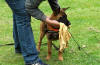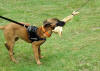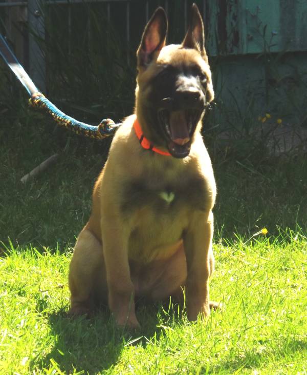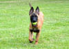 Dizzy hat zur Zeit nicht viele Zähne zur Verfügung, weil sie ja mitten in der Renovierungsphase ihres Besteckkastens steckt ;) Wir machen daher nicht viel Belastung auf die Griffe. Um aber nicht gänzlich untätig zu sein, trainieren wir schon mal hohe Anbisse und das Springen in den Helfer hinein. Die Beute wird dem Hund hierbei nicht ins Maul gesteckt sondern er muss sie selber holen. Leider sieht man viele Malis die nicht vernünftig abspringen und daher entweder aufrennen oder nur schlechte Griffe setzen können. Dizzy soll von Anfang an lernen hoch ab zu springen und in die Beute zu zielen. Anfänglich zielte sie eher auf die Hände des Helfers, jetzt aber bekommt sie das schon sehr gut hin und springen kann sie wie ein Känguru ;) Nach dem Anbiss wird die Beute sofort geschenkt und Dizzy darf sie tragen und halten. Da sie eher der misstrauische Alleingänger ist, lege ich großen Wert darauf sie anfassen und kontrollieren zu können, wenn sie die Beute hält. Eine Hand fixiert sie dabei im Becken damit sie nicht herumhampelt und die andere den Fang um Knautschen zu vermeiden und Ruhe in die Sache zu bringen falls nötig. Dizzy lässt das aber ganz ruhig über sich ergehen und hält immer den Helfer im Auge, der ihr vielleicht die Beute abnehmen könnte. Sie ist sowieso eher ein ruhiger Typ. Beim Halten der Beute ist sie schon fast tiefenentspannt. Das AUS wurde wie schon beschrieben und im Video gezeigt zu Hause einstudiert und gefestigt, daher beherrscht sie diese Übung auch beim Schutzdienst schon sehr gut. Nach dem Ablassen wird gleich wieder Trieb gemacht und sie schaltet sehr schön in die aktive Phase des Schutzdienstes um. Dizzy´s Griffverhalten ist von Natur aus immer fest, ruhig und voll. Sie will nach Vorne und zeigt sich von nervlicher Belastung durch den Helfer unbeeindruckt. Wir sind also schon mal sehr zufrieden mit der kleinen Maus. Wenn sie wieder vernünftig zupacken kann und alle Zähne fest stehen, werden wir sie auch im Griff wieder belasten. Anschließend werden auch Belastungsphasen mit dem Softstock hinzukommen. Aber bis dahin machen wir nur ab und zu mal eine Übungseinheit wie gezeigt, um Trieb und Sprungverhalten zu schulen.