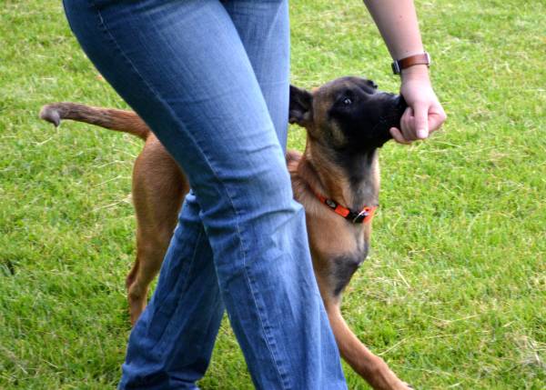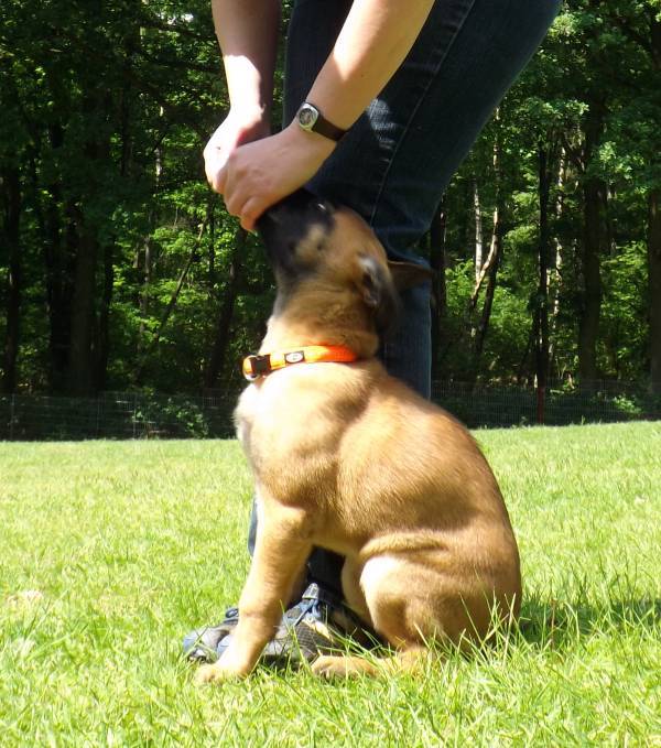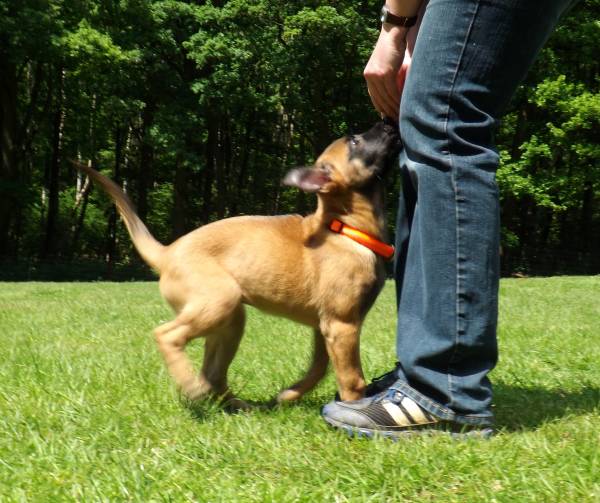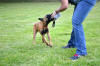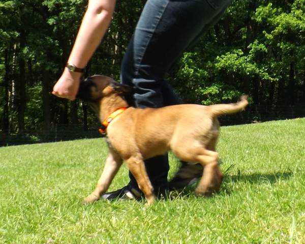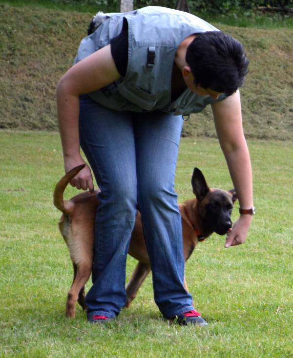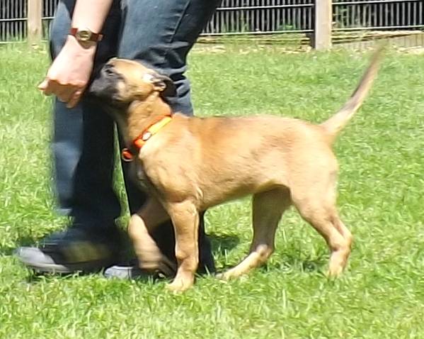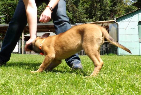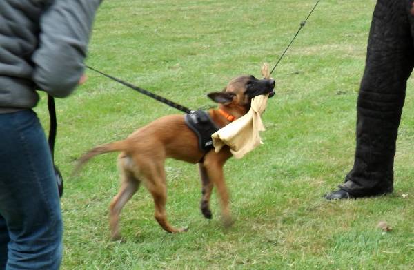 im Alter von 12 Wochen DizzyDevil erste Schritte Abt. C Wir treiben die Beute und den Helfer munter vor uns her und lernen den Anbiss und auch schon das Halten von ruhigen Griffen. Auch die Kontrolle durch den HF wird schon geübt, aber wir stehen noch ganz am Anfang. Dizzy bekommt höchstens ein bis zwei Anbisse, darf die Beute Halten und Tragen, danach sichern wir den erbeuteten Lappen gemeinsam im Auto! ;)