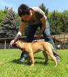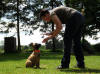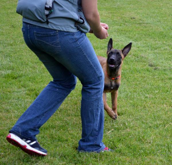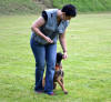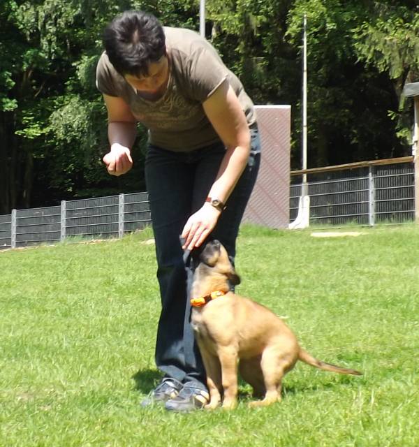 Dizzy lernt die Positionen über Futter und führt diese noch über Hör-und Sichtzeichen aus. Die Übung GUCK gehört immer mit dazu und wird eine Art Schlüsselreiz um etwas zu bewirken. Vor und nach jeder Übung wird Blickkontakt verlangt. Wir bringen langsam Distanz zum Hundeführer hinzu und schleichen die Hilfen nach und nach aus. Da sie ein eher ruhiger Typ ist, legen wir viel Wert auf ausgiebiges und actionreich gestaltetes Spiel um später mehr Schwung in die Sache hinein bringen zu können. Momentan Werden Übungen und Spiel getrennt voneinander einstudiert, später setzen wir beides zusammen und möchten dann gern einen triebigen und primärmotivierten Partner an unserer Seite haben!