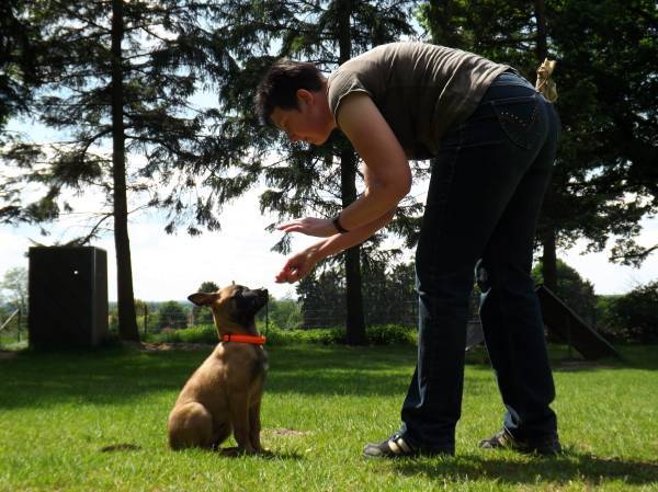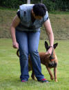 Sozialverhalten und Umwelteinflüsse Dizzy wird während der Übungsstunde angebunden und darf zusehen, was die anderen so machen. Sie bekommt dadurch sehr viel mehr mit als im Auto und muss sich auch mal alleine behaupten. Ab und zu geht jeder mal zu ihr hin, sie wird gestreichelt, bekommt auch schon mal ein Leckerchen, so werden alle Zweibeiner positiv verknüpft. Sie sieht andere Hunde und lernt sie zu akzeptieren und nach Möglichkeit zu ignorieren. Auch das Schießen auf der Platzanlage ist für sie was ganz normales. Außerdem fahren wir innerhalb der Woche auch schon mal in die Fußgängerzone und lernen Autos, Radfahrer und viele Passanten kennen. Eine Welpenschule besuchen wir nicht. Ich halte das Spielen mit anderen Hunden für eher kontraproduktiv. In unserer Sportart soll sie sich ausschließlich auf Zweibeiner konzentrieren und Umwelteinflüssen neutral gegenüber stehen.