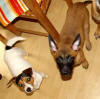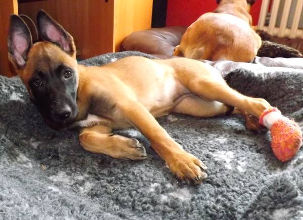 Dizzy mit 3 Monaten bei der Arbeit Dizzy mit etwa 12 Wochen Schon mit dem ersten Verband, weil eine Kralle weniger :( Malis sind bescheuert! Vor lauter Herumgespringe schon verletzt... Trotzdem quietschvergnügt mit Mama Cera, Oma Bijou und "Tante" Hexe auf dem Gartenspielplatz! Bilder aus dem Training Anfang Juni 2013 Dizzy lernt auch mal allein zu bleiben und schaut den anderen Hunden bei der Arbeit zu. Sie lernt ihre Übungen auch mal auf der großen Wiese zu machen, das klappt zwar noch nicht so gut wie in der heimischen Küche aber die kleine Maus macht ihre Sache ganz gut. Auch mit dem Helfer durfte sie kurz spielen und hat ihm auch gleich den Lappen abgenommen! :)