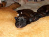 Ich bitte die eher schlechte Qualität der Bilder zu entschuldigen. Man bedenke, dass solch eine Geburt auch für mich eine sehr spannende und aufregende Sache ist, besonders mit einer Erstlingshündin. Da hat man nicht immer das ruhigste Händchen zum fotografieren und filmen, aber ich denke ein paar brauchbare Aufnahmen sind dabei. ;) Geburtsverlauf Cera wurde an Tag 63 sehr nestgebunden und wollte das erste Mal nicht mehr im Feld spazieren gehen. Sie war unruhig und zeigte deutlich an, dass wir jetzt sofort wieder zurück gehen müssten. Zu Hause angekommen hat sie sich sofort schlafen gelegt. Ab und zu fing sie an zu scharren und ihr Lager zurecht zu rücken. In der Nacht dann konnte man deutlich Wehentätigkeit erkennen. Die Hündin war unruhig, wollte hinaus und entleerte sich einige Male. Super es geht los! Ja, denkste, nach etwa einer Stunde war der ganze Zauber vorbei. Cera legte sich friedlich zum Schlafen hin und stand auch nicht mehr auf bis zum nächsten Morgen. An Tag 64 dann begann sie doch sehr unruhig zu werden. Wieder eine Stunde lang Unruhe und Nestbau im Garten, danach wieder Ruhe. Ziemlich genervt hatte ich mir schon überlegt doch mal einen TA auf zu suchen, wenn bis zum Abend nichts mehr passiert. Aber am Nachmittag dann, wurde sie wieder unruhig und nach einer Stunde hechelte sie auch und fing dann auch bald an zu pressen. Von da an ging alles rasend schnell! Die Welpen kamen zu Anfang im 15 Minuten Takt und Cera hat ihre Sache prima gemeistert. Beim ersten Welpen war sie noch etwas unbeholfen aber die nächsten hat sie dann fast im Alleingang ausgepackt und versorgt. Fast auch nur deswegen, weil ich es nicht lassen kann meine Finger immer mit dabei zu haben ;) Sie hätte das auch ganz allein hinbekommen! Die Geburt verlief reibungslos und ohne medizinische Hilfe. Alle Welpen kamen komplett in der Fruchthülle zur Welt. 2 in Hinterendlage, der Rest mit der Nase nach vorn. Alle Welpen und auch die Mama scheinen wohl auf und wir freuen uns auf die gemeinsame Zeit!
