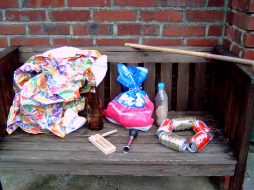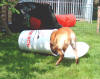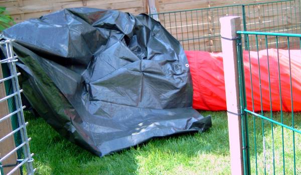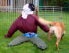 Hierbei braucht man nicht viel Geld aus zu geben. Mit einfachsten Mitteln kann man sich die tollsten Spielideen selber basteln. Eine einfache Plastiktüte gefüllt mit Blechbüchsen macht super viel Krach und ist am Anfang sehr gewöhnungsbedürftig. Getränkedosen zu einer Rassel zusammen gebunden tun ebenfalls gute Dienste bei der Geräuschgewöhnung. Alte Plastikflaschen kann man mit Steinen oder Sand füllen um ein tolles Rascheln zu erzeugen. Fahrradhupe Ratsche; bekommt man im Spielwahrenhandel Eine Alte Plastiktischdecke ideal zum Verstecken von Bringseln oder zum Bedrängen fürs Körtraining Ausgedienter Ballpool unserer Tochter; im Urzustand ideal zum ertasten von verschieden Untergründen, ist nämlich ganz schön komisch an den Pfoten so was glitschiges. Im Sommer kann man natürlich auch Wasser einfüllen nur sollten Welpen und kleine Hunde nicht unbeaufsichtigt damit spielen. Unsere Bijou verschwindet beim tauchen nach ihrem Lieblingsball gern mit dem gesamten Oberkörper im kühlen Nass. Gefüllt mit allerlei Spielzeug ist er sicher auch für Welpen eine Entdeckungsreise wert. eine ausgelegte Plane oder ein Zelt, vielleicht kombiniert mit einem Tunnel eignet sich hervorragend zum Verstecken von Bringseln oder Futterstücken. Das Knistern und der unangenehme Blick ins Dunkle sind nach ein paar mal Ball finden sicher schnell vergessen und der Hund baut immer mehr Trieb auf. Bijou ist nicht mehr zu halten wenn sie eine Plane sieht. Eine Wippe zum drüberlaufen ist aus einem stabilen Brett und einer Tonne schnell selbstgebaut. Am Besten führt man den Hund an der Futterhand über die Wippe und lässt ihn auf der Mitte stehen, damit unser Vierbeiner lernt erst herunter zu laufen wenn das Brett nach unten kippt. Wie man sieht hat unsere Tochter Sina genau so viel Spaß wie Bijou an unserem kleinen Spielplatz. Ein Rollbrett; besteht einfach nur aus vier Möbelrollen und einem Brett. Zugegeben für Bijou reicht dieses hier nur als Skateboard aber Spaß macht ihr das Herumfahren auf dem wackligen Brett trotzdem. Guck, guck hier ist der allseits beliebte Dosenvorhang. Das Durchlaufen eines Dosenvorhangs ist Pflichtprogramm auf den meisten Wesensprüfungen oder bei der Körung, nicht nur im Maliclub. Wenn man dem Hund beibringt immer eine Belohnung zu bekommen wenn er selbstständig Kontakt mit den klapprigen Dingern sucht, wird unser Hausgenosse auch diese Übung mit Freude und viel Trieb meistern. Ein Tipp : Wenn Ihr das Glück haben solltet in Grenznähe zu wohnen, Getränkedosen gibt es in Holland noch ohne Dosenpfand. Die klappern besser und sind nicht so scharfkanntig wie Konserven. Klar, dass auch Sina keine Angst hat vor Klapperdosen und gute Freunde machen immer alles gemeinsam. Ein Klapperblech sorg für eine urige Geräuschkulisse. Verschiedene Untergründe zu betreten ist nicht für jeden Hund selbstverständlich. Merkt man dann spätestens, wenn beim Tierarztbesuch die glatten Fliesen ein echtes Problem werden und wir den Hund hineintragen müssen damit er sich nicht selbst verletzt. Eine stabile Plexiglasscheibe, eine Gummimatte und verschieden artige Plastikplanen eigenen sich genauso gut wie die schon erwähnten, glatten Fliesen. Findet der Hund dort ein paar versteckte Leckerchen oder einen Ball dann wird das Betreten von verschiedenen Bodenbelägen kein Problem mehr sein. Ein Spielzeugtunnel, eigentlich von unserer Tochter, lädt zum "rumtunneln" ein. Da wir Bijou immer mit einem Bringsel am anderen Ende des Tunnels erwartet haben, hört sie gar nicht mehr auf hindurch zu laufen. Sie entwickelt eine ungeheuere Schnelligkeit, schwierig sie dabei mit der Kamera zu erwischen aber nicht unmöglich. Eine Futtertonne dient als Versteck für Bijous Ball. Wenn man erst einmal heraus hat wie man den Deckel auf bekommt, eigentlich ganz einfach. Ein supertolles Spiel zur Förderung des Beutetriebes natürlich wird auch die Intelligenz und das Selbstvertrauen des Hundes gesteigert. Ein Tipp: Eine geleerte Papiermülltonne eignet sich auch ganz toll. Das Spiel kann natürlich auch von Zeit zu Zeit abgewandelt werden z. B. die Tonne auch mal aufrecht stehen lassen oder ein paar Luftballons und Dosen hineinlegen. Ist ganz erstaunlich was sich so ein Hund alles einfallen lässt um an sein Triebziel zu gelangen. Auf einem schmalen Steg entlang zu laufen erfordert einige Übung und fördert das Vertrauen zum Hundeführer. Eine lebensgroße Puppe wird gerne bei Wesensprüfungen oder Körungen benutzt. Ob einfach nur da hängend oder an einer Schnur hochgezogen ist sie ganz schön unheimlich wenn man nicht damit rechnet. Zur Gewöhnung an solche Spielchen kann man einfach Futter oder ein Bringsel am "Feind" verstecken, dann sucht der Hund den Kontakt bald von selbst. Unsere Tochter ist selbstverständlich auch "wesensfest" und wollte auch noch mal ins Bild. Eine stabile Plexiglasplatte liegt auf ein paar Kisten und wird somit zum Podest. Natürlich kann man auch zu Zweit darauf platz nehmen. Kanister, Plastikkisten oder Pappkartons eignen sich hervorragend zum Verstecken von Bringseln. Eine echte Abenteuerburg zum erkunden. Unser Abenteuerspielplatz wird ständig verändert und erweitert, damit es nie langweilig wird. Bijou und auch Sina sind ganz begeistert von soviel Action, wie man auf den Bildern unschwer erkennen kann. Sicher werden auch unsere Welpen ihren Spaß daran haben. Ich kann Euch nur empfehlen auch so etwas in Eurem Garten zu veranstalten. Die Arbeit mit dem Hund, ganz zwanglos nur mit Hilfe von Futter und Spielzeug macht auch dem Hundeführer viel Spaß. Und wenn man sieht mit wie viel Freude und Trieb der Hund angeregt wird selbstständig eine Lösung zu finden, um eine Aufgabe zu meistern kann man sich an solch einem arbeitseifrigen Vierbeiner gar nicht mehr satt sehen! |