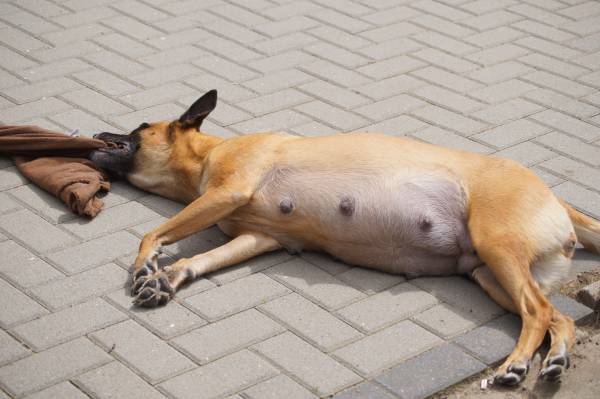 An Tag 63 sind die Flanken etwas eingefallen. Ein gutes Zeichen! Die Früchte haben sich gesetzt, in den nächsten 2 Tagen sollte sich was tun. In der Nacht von Tag 64 auf 65 ist die Hündin deutlich unruhig, stöhnt, will hinaus und buddelt weiter an ihrem Nest im Garten. Nach etwa einer drei viertel Stunde ist der ganze Spuk aber vorbei und wir schlafen ruhig weiter, naja sie zumindest..... An Tag 65 zeigt sie sich unruhig, erbricht und entleert sich. Der Krater im Garten wird weiter ausgehoben.....