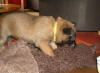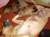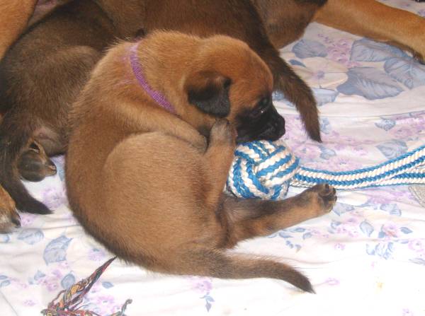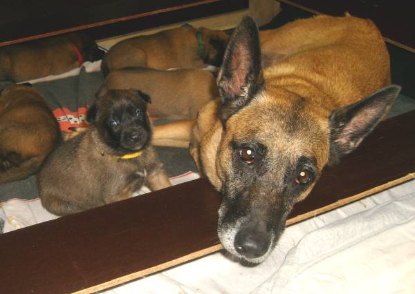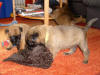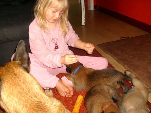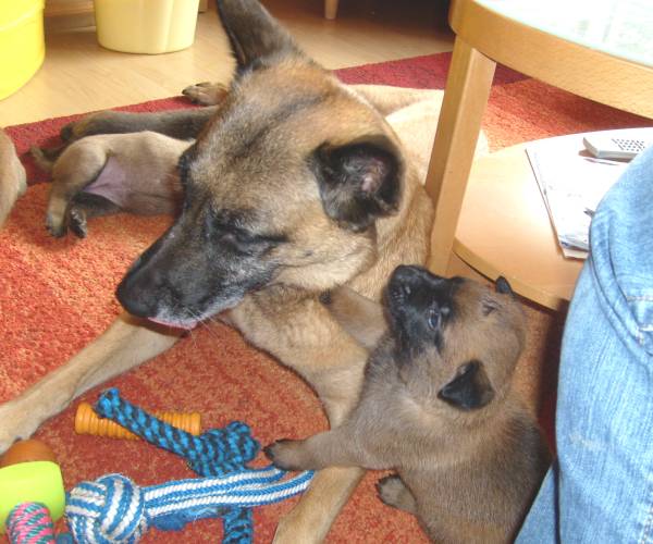 Und auch die vierte Woche ist vollendet! Jetzt werden die kleinen Maliattacks richtig frech und knabbern und beißen an allem herum was ihnen vor den Fang kommt. Leider hat Bijou schon sehr darunter leiden müssen. Sie hat über Tag so tief und lange geschlafen, dass wir schon in Sorge waren und dachten sie wäre ernsthaft krank. Daher haben wir sie aus dem Welpenraum entfernt und ihr mal eine Nacht ganz ihre Ruhe gelassen und siehe da sie erholte sich auf wundersame Weise. Die kleinen "Teufelchen" haben der Mama sogar schon die Nase blutig gebissen also müssen sie jetzt nachts allein klar kommen. Bijou soll ja schließlich schnell wieder fit werden. Das mit dem Fressen aus dem Napf klappt inzwischen auch ganz gut und daher sind sie Welpen hier auch nicht wirklich nachtragend. Über Tag geht Bijou auch freiwillig ins Welpenzimmer und selbstverständlich dürfen die Kleinen dann auch noch mal Muttermilch trinken. Aber die drei Mahlzeiten mit fester Nahrung werden ebenso gerne angenommen. Momentan machen die kleinen Gremlins nur das Haus unsicher, aber nächste Woche gehen wir auch mal raus in den Freilauf.