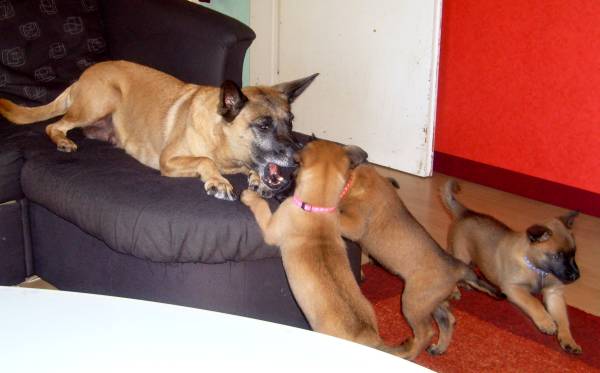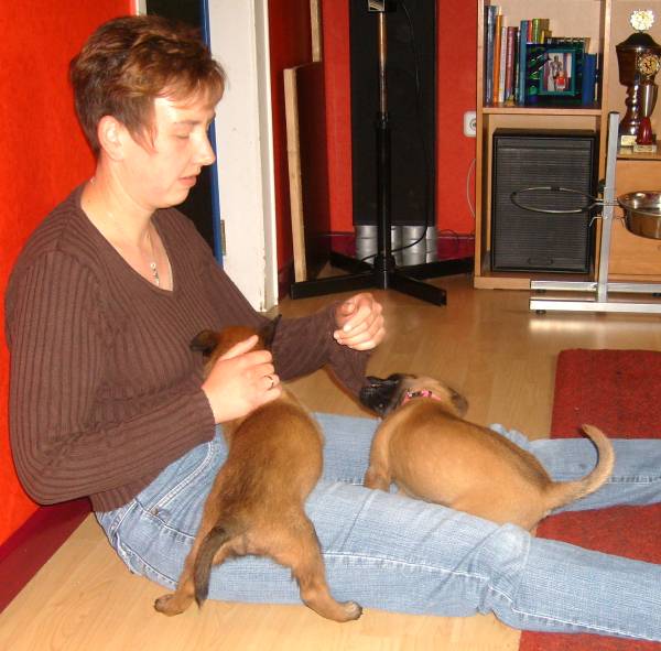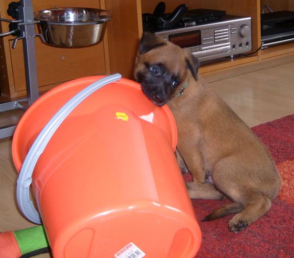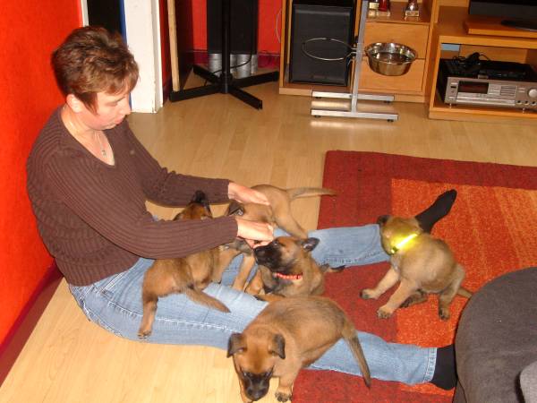 Die 6. Woche liegt hinter uns und so langsam aber sicher wird es Zeit, dass die kleinen Raufbolde umziehen. Die Wohnungseinrichtung leidet und Mama kann sich nur noch auf dem Sofa in Sicherheit bringen. Treppensteigen haben die Rabauken von ganz allein gelernt und machen nun auch die obere Etage unsicher, wenn man sie nicht daran hindert. Jeden Morgen pflücke ich 2 bis 3 Welpen von der Treppe die schon auf dem Weg nach oben waren. Den kleinen Auslauf im Garten finden sie mittlerweile langweilig. Weil ich so blöd war, ihnen zu zeigen dass der Garten auch noch mehr zu bieten hat, wollen sie jetzt nur noch draußen laufen und jammern und knatschen den ganzen Tag, wenn man sie nicht hinaus lässt, obwohl sie so viele Spielsachen und auch reichlich Platz im Auslauf hätten. Wäre ja alles nicht so schlimm, aber wenn sie draußen laufen kann man nicht genug Augen, Arme und Hände haben um sie von Dummheiten ab zu halten. Um 6.00 Uhr morgens spätestens, jaulen die Welpen so laut, dass man schon allein deswegen aufsteht um nicht die Nachbarn zu verschrecken. Alles in allem haben mich die Kleinen also sehr gut im Griff. Wir freuen uns also alle gemeinsam auf Woche 7.Züchten ist etwas wunderbares!! :)